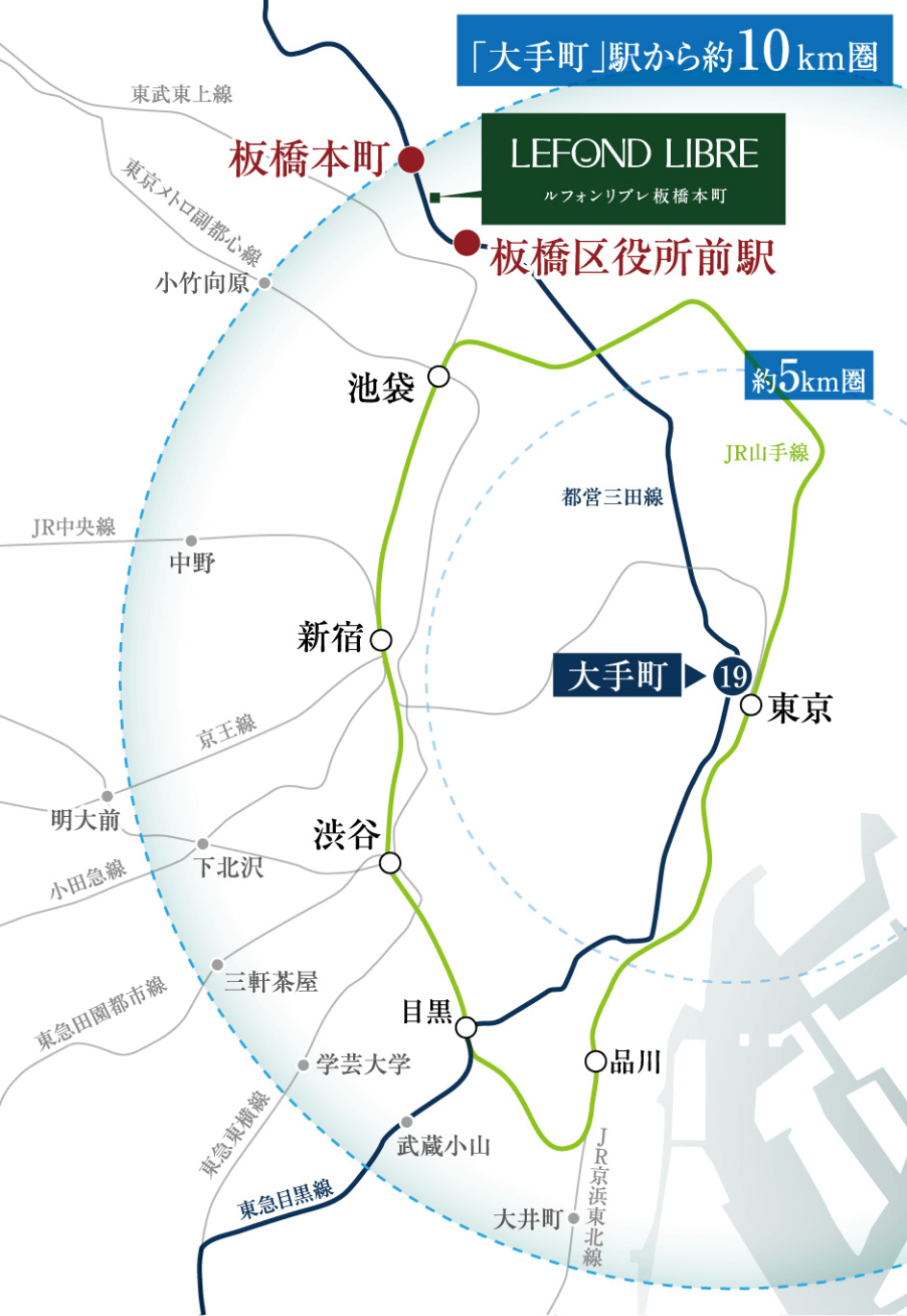 最寄駅となる「板橋本町」は、「中野」や「三軒茶屋」とほぼ同じ都心距離を享受する“大手町10km圏内”に位置しています。さらに、日常の足となる都営三田線は「大手町」へ19分のダイレクトアクセスを可能にする便利な路線。都心と軽快につながるポジションが、時間のゆとりを心のゆとりに変える贅沢な日常を叶えてくれます。