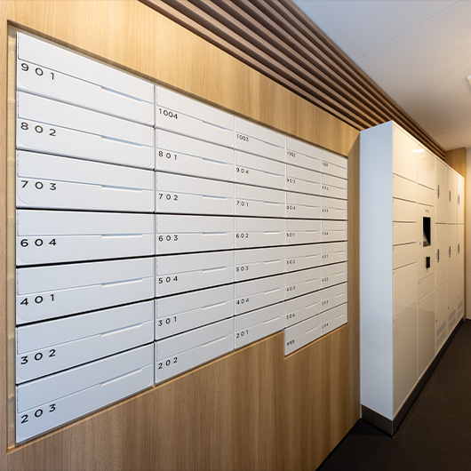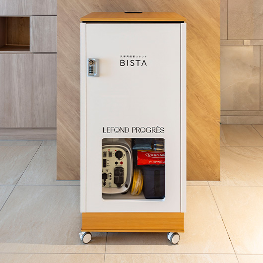共用部にはルフォンプログレオリジナル防災備品を設置し、万が一の場合に対応。