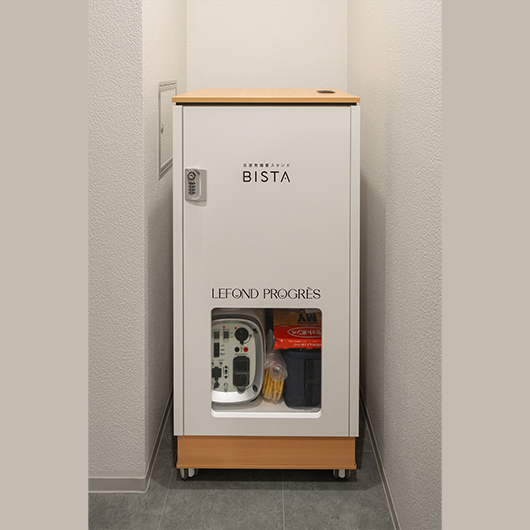共用部にはルフォンプログレオリジナル防災備品を設置し、万が一の場合に対応。