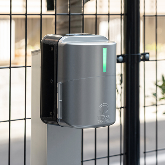 平置き駐車場にEV充電器を導入。